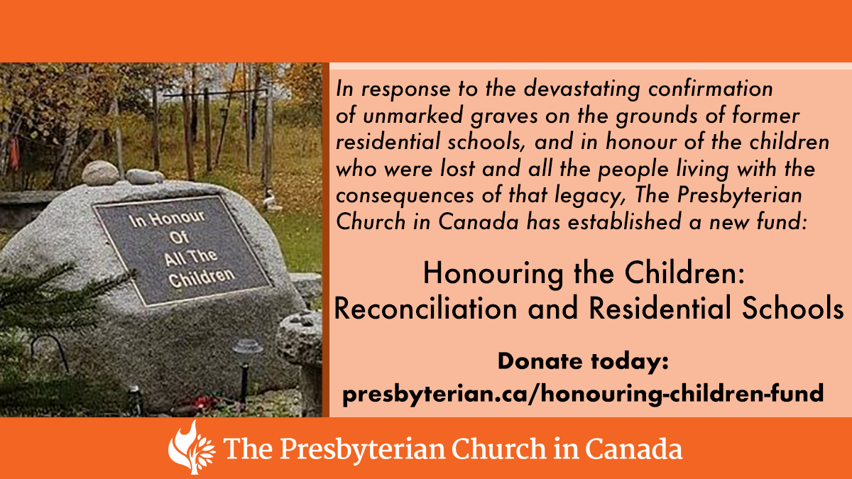 In response to the devastating confirmation of unmarked graves on the grounds of former residential schools, and in honour of the children who were lost and all people living with the consequences of that legacy, The Presbyterian Church in Canada has established the Honouring the Children: Reconciliation and Residential Schools Fund. This fund will support initiatives associated with searches for unmarked burial sites in communities where schools were operated by The Presbyterian Church in Canada.