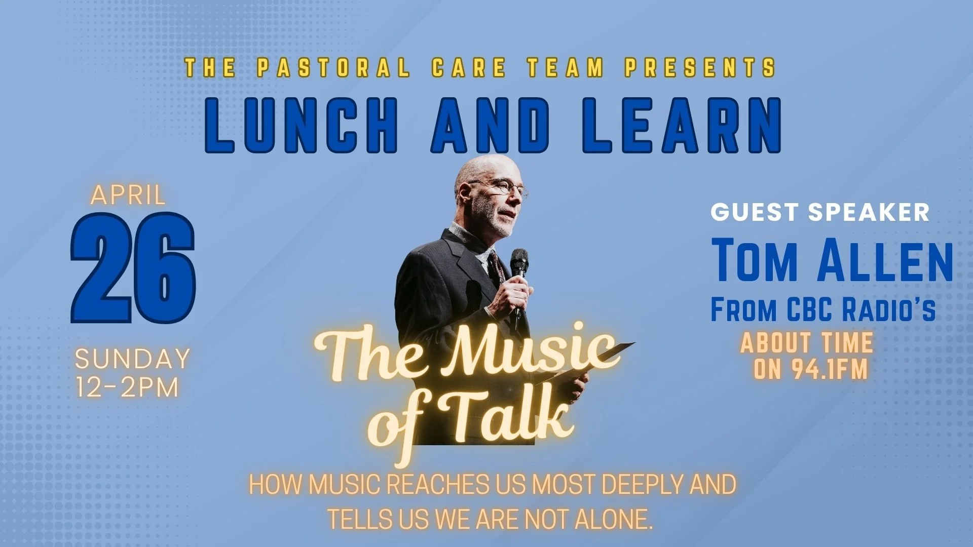 Our Pastoral Care Team is hosting this year’s Lunch and Learn on Sunday April 26 from 12-2pm in the church hall featuring our guest speaker Tom Allen from CBC Radio’s About Time.